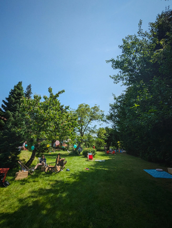 W ogrodzie czeka zielona strefa relaksu z leżakami i hamakami, huśtawki, zjeżdżalnia, kuchnia błotna i góra piachu dla dzieci oraz miejsce na ognisko. Do dyspozycji jest również drewniany domek, w którym obecnie znajduje się nasza klimatyczna lodziarnia.